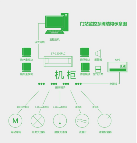 門站監控設備采用“可編程邏輯控制器( PLC)”作為主控制器,通過PLC的模擬量輸入接口用來采集壓力變送器、溫度變送器等具備4-20mA電流輸出的儀表;模擬量輸出接口用來控制加臭機等設備;數字量輸入接口用來采集燃氣泄漏報警、切斷閥狀態等信號;數字量輸出接口用來控制閥門.報警指示燈等設備,RS485通訊接口用來與流量計和其他串行設備通訊:以太網接口用來與門站監控計算機通訊。